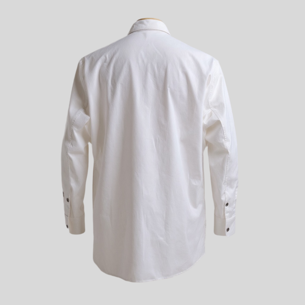 Inspired by military field uniforms, this shirt is cut from crisp cotton poplin with a clean, architectural silhouette. The fabric delivers both structure and breathability, holding its form while remaining comfortable for daily wear.